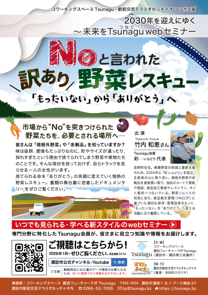 でも「Webを通してなら問題ないのでは」と、当会員の各専門分野の視点から、2030年という未来の課題解決のヒントとなる内容を伝える動画制作の企画をスタートさせました。発信には〔諏訪市公式YouTubeチャンネル〕を活用させてもらっています。