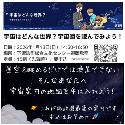 最初は文化センターで講義。引き続き、夕方からは諏訪湖近くにあるヘリポート広場で「天体観測」が開催されるという豪華イベント。