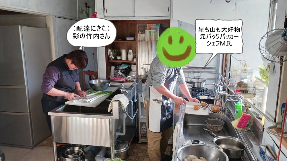 プライベートで駆け付けたシェフ・M氏(下諏訪町在住)と、配達に来ただけなのに自家製の漬物3種を差し入れてくださり、なぜか料理まで作ってくれる竹内さんによって、約20人前の「こだわり・牛すじ入りポトフ」や色とりどりの野菜料理が出来上がっていきます。(ポトフの写真は撮り忘れるという失態)