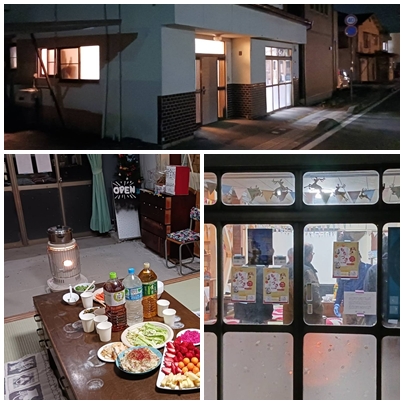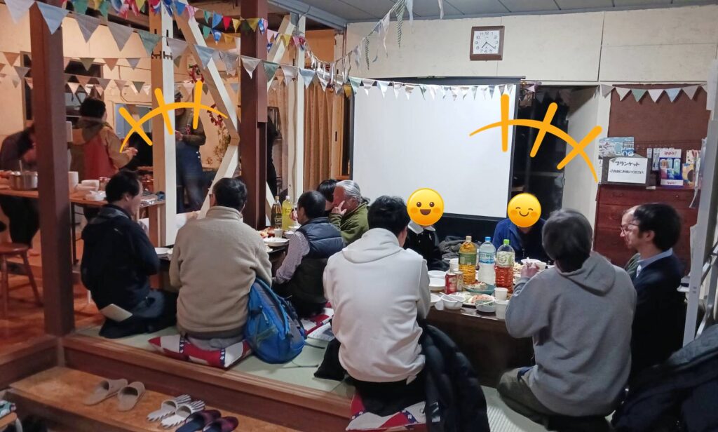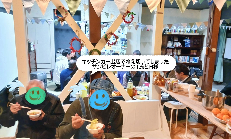 このサンサンビレッジオーナーで会員のT氏や、一緒に広場でキッチンカーを出してくれた地元のHさんも遅れて登場。最初は「寒い…!!」と震えていた皆さんが、温かいポトフと、美味しい料理が並ぶホッとできる空間に、徐々にお顔と心が温まり、ほころんでゆくのが印象的でした。