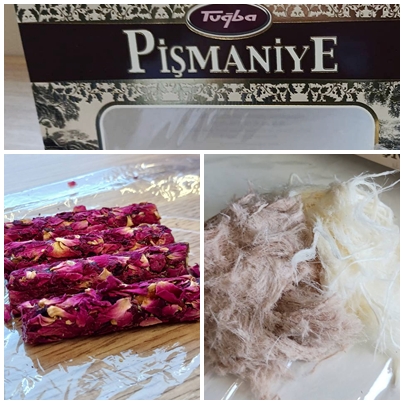 ピシュマニエ(Pişmaniye)…小麦粉と砂糖を飴状にして何層にも引き伸ばした、トルコの伝統的な綿菓子のような甘いお菓子、らしいです。